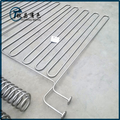 鈦盤(pán)管常用來(lái)作為容器內(nèi)部加熱和冷卻。盤(pán)管的固定方式有不可拆與可拆兩種,這要根據(jù)物料的情節(jié)程度及服飾情況決定,但在設(shè)計(jì)上盡可能用可拆式,以便于鈦盤(pán)管的清潔與檢修。