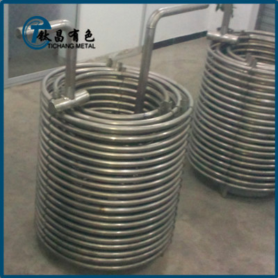 鈦盤(pán)管常用來(lái)作為容器內(nèi)部加熱和冷卻。盤(pán)管的固定方式有不可拆與可拆兩種,這要根據(jù)物料的情節(jié)程度及服飾情況決定,但在設(shè)計(jì)上盡可能用可拆式,以便于鈦盤(pán)管的清潔與檢修。